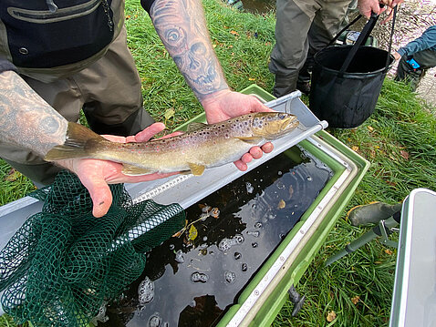 Am 26. Oktober 2022 wurden die Fischbestände der Spree auf einen Abschnitt von ca. 400 m Länge in zwei Durchgängen mittels Elektrobefischung untersucht. Zuvor wurde am Ende der Befischungsstrecke eine Absperrung eingebracht, durch die das Auswandern von Fischen und Neunaugen während der Untersuchung verhindert werden sollte. Alle Fische wurden auf Artniveau bestimmt und deren Länge aufgenommen. Zusätzlich wurde eine dem Gesamtfang entsprechende Anzahl von Individuen pro Art gewogen. Insgesamt konnten bei zwei Durchgängen 1.739 Individuen aus neun Arten dokumentiert werden.